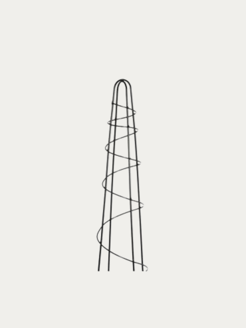 Matta musta metallinen obeliski kukka- ja köynnöstueksi pihaan ja puutarhaan. Korkeus 150 cm.