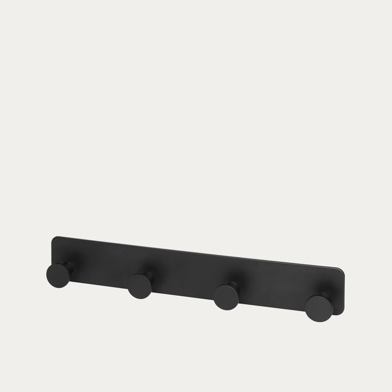 Musta metallinen naulakko neljällä koukulla. Tuotteen mukana toimitetaan 3M kiinnitysteippi ja ruuvit, valitse oikea kiinnitystapa seinämateriaalin mukaan. Jauhemaalattu metallipinta. Enimmäiskuormitus 2,5 kg.