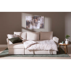 Aalborg vuodedivaanisohva beige -sävyssä on käytännöllinen vuodedivaani jonka kätisyys on vaihdettavissa myös kotona helposti.