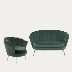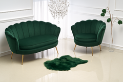 Luo kotiisi ylellinen ja kutsuva tunnelma tällä elegantilla sohvaryhmällä, joka sisältää tyylikkään kahden hengen sohvan ja yhteensopivan nojatuolin. Vihreä samettiverhoilu on pehmeä ja elegantti, ja sen kaarevat muodot tuovat sisustukseen ripauksen romantiikkaa.