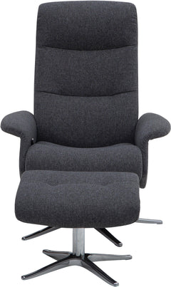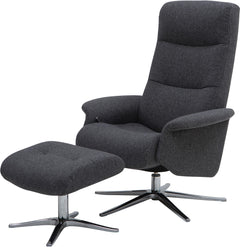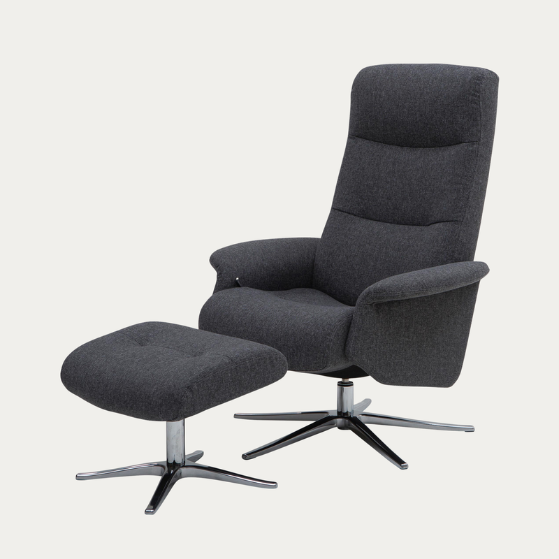 Aries-tuoli ja rahi pehmeässä harmaassa kankaassa tarjoaa mukavan levon. Metallinen jaloissa musta sävy luo nykyaikaisen ilmeen ja tukevan pohjan.