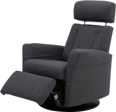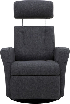 Baron recliner harmaa kääntyvä lepotuoli tarjoaa rennon istumiskokemuksen sävynään syvänharmaa kangas ja oikea tai vasen kätisyys.
