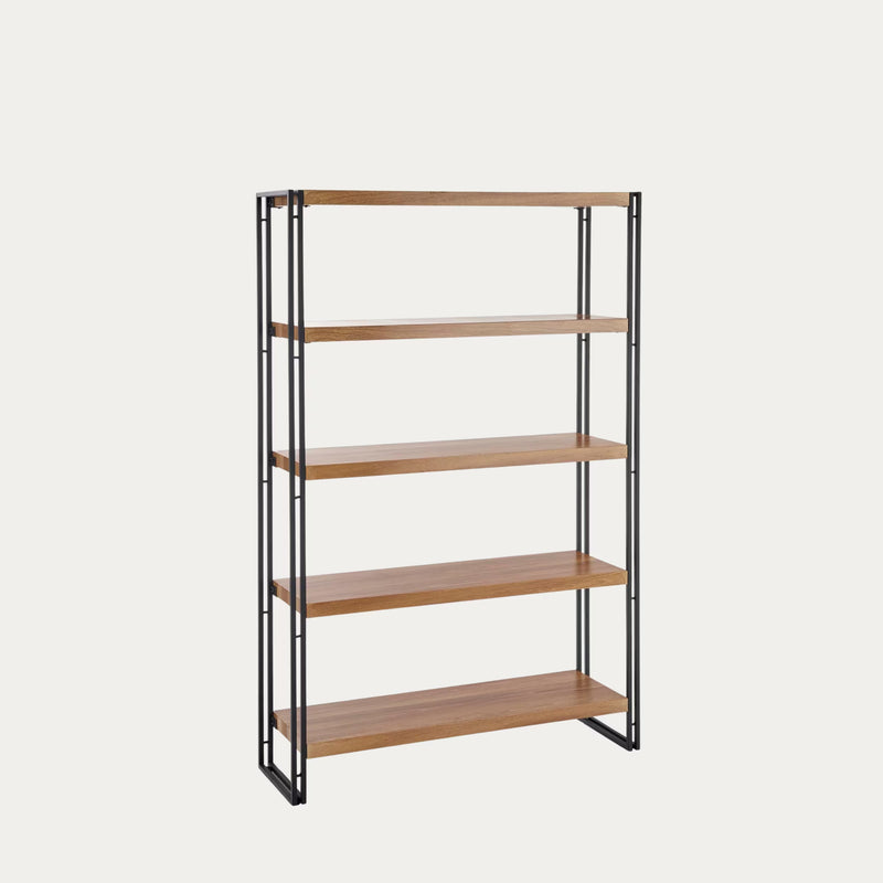 Bolivar-hyllykkö on tyylikäs ja tukeva säilytysratkaisu, jossa yhdistyvät ajaton muotoilu ja teollishenkinen ilme. Musta metallirunko tuo ryhtiä ja vakautta, kun taas lämpimän sävyiset puuhyllyt tuovat sisustukseen luonnonläheistä pehmeyttä. Viisi tilavaa hyllytasoa tarjoavat runsaasti säilytystilaa kirjoille, koriste-esineille, viherkasveille tai muille tärkeille tavaroille.