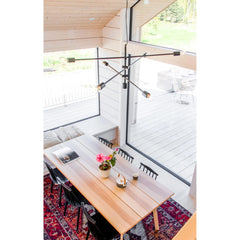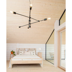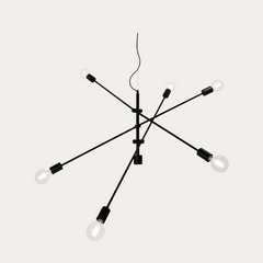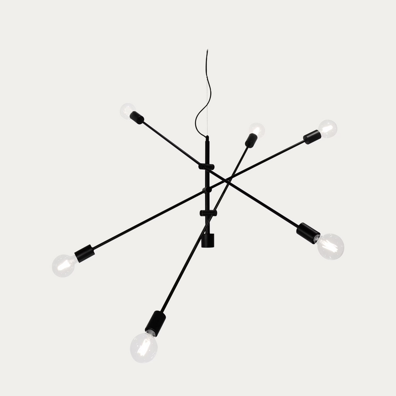 Moderni mattamusta riippuvalaisin, jossa on kolme säädettävää valaisinvartta ja yhteensä kuusi valopistettä. Tyylikäs ja näyttävä valaisin sopii erinomaisesti isompiin tiloihin, joissa tarvitaan runsaasti valoa. Jokaisen valaisinvarren pituus on 110 cm, ja niiden kulmaa voi säätää vapaasti haluttuun suuntaan.