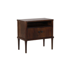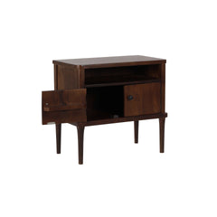 Retrohenkinen ByNiemen Durham-sivupöytä on valmistettu kestävästä mangopuusta, jonka syvä tummanruskea sävy tuo sisustukseen lämpöä ja luonnetta. Massiivipuinen rakenne takaa pöydän ajattoman ilmeen ja pitkän käyttöiän. Kompaktin kokonsa ja tyylikkään muotoilunsa ansiosta se toimii erinomaisesti myös yöpöytänä esimerkiksi makuuhuoneessa.