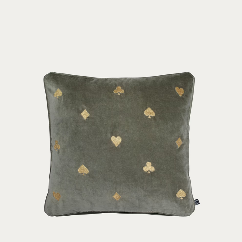 Koristetyyny, jossa on kaunis kullanhohtoinen kirjailu ja vetoketju alareunassa. Mitat 50x50cm. Tyynyn päällinen on 100% puuvillaa. Muhkea höyhentäytteinen sisustyyny.