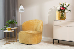 Keltainen Emma-lepotuoli tuo tilaan pirteän säväyksen ja pehmeän istuinmukavuuden, sopien niin olohuoneeseen kuin makuuhuoneeseen.