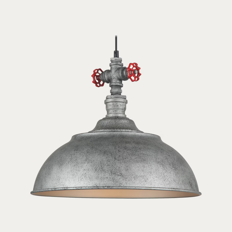 Eric on tyylikäs industrial tyylinen riippuvalaisin. Patinoitunut hopeanvärinen varjostin punaisine hanoineen antaa tilaan teollista tunnelmaa.