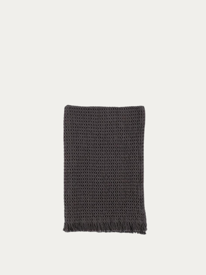 Fanni K Ruutu käsipyyhe on valmistettu kierrätetystä vohvelisidoksesta. Hapsureunat lyhyillä sivuilla. Ripustuslenkki pitkällä sivulla. Koko 50x70 cm. Materiaali 100 % kierrätyspuuvilla.
