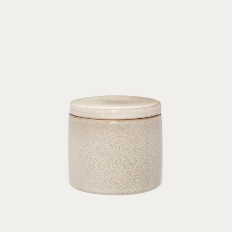 Keraaminen kannellinen pumpulipurkki reaktiivisella lasituksella. Jokainen tuote on uniikki, sillä värin sävy vaihtelee tuotteittain.