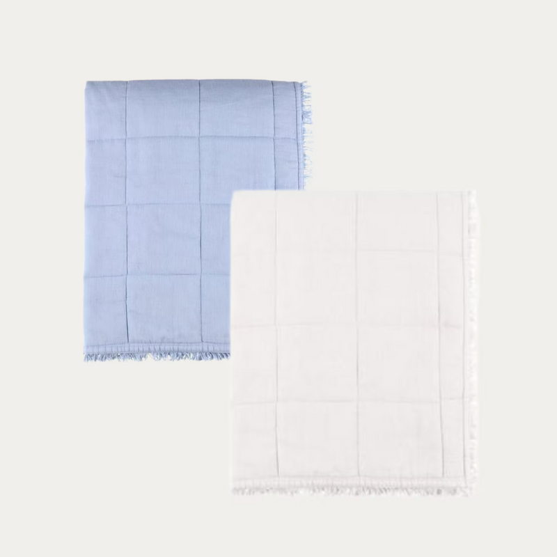 Fanni K Kuru tikatussa torkkupeitteessä on kevyt vanutäyte sekä lyhyet hapsut. Koko 130 x 170 cm. Väri valkoinen tai taivaansinen. Materiaali 100 % puuvilla, täyte polyesteri. Pesu 30 astetta.