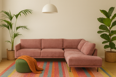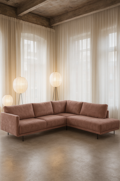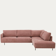 Tämä avokulmasohva on verhoiltu lämpimän vaaleanpunaisella kankaalla, mikä luo pehmeän ja kutsuvan ilmeen. Sohvan jalat ovat mustat ja ohuet, mikä lisää modernia ilmettä ja keveyttä kokonaisuuteen.