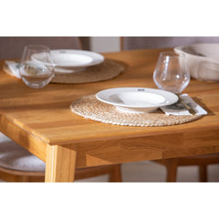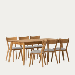 Tervetuloa nauttimaan yhteisistä hetkistä tämän elegantin ja tilavan tammisen ruokaryhmän äärelle. Laadukkaasta tammesta valmistettu pöytä ja kuusi yhteensopivaa tuolia muodostavat harmonisen kokonaisuuden, joka yhdistää skandinaavisen muotoilun, toimivuuden ja ajattoman estetiikan.