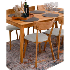 Ruokapöydän siro mutta tukeva rakenne tarjoaa runsaasti tilaa aterioille, juhlahetkille ja arjen kokoontumisille. Kauniisti kaareutuvat tuolit on muotoiltu ergonomisesti, ja niiden vaaleaksi verhoiltu istuinpehmuste lisää istuinmukavuutta ilman kompromisseja tyylin suhteen.