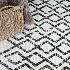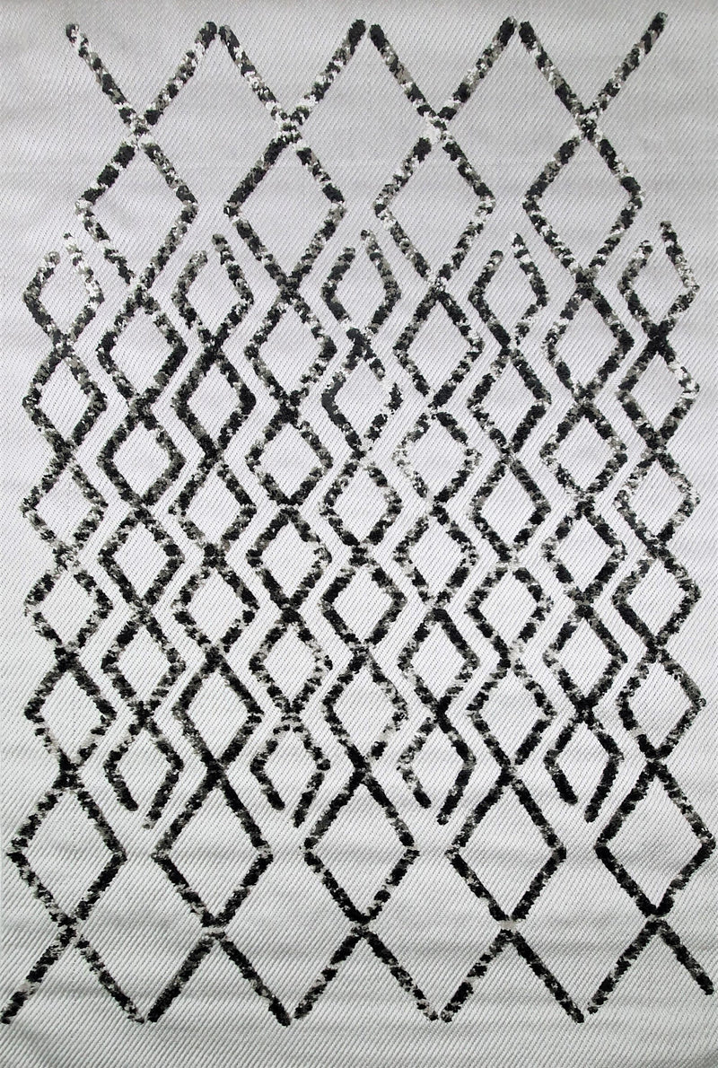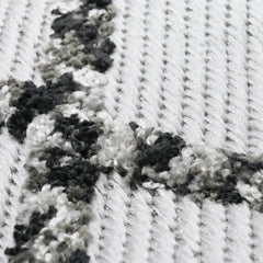Hanki matto on valkoisen ja mustan yhdistelmä, jossa on yksinkertainen geometrinen kuvio. Saatavana kahdessa eri koossa, sopii monenlaiseen sisustukseen.