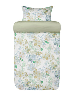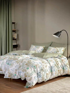 Raikas kukkakuosi luo rauhoittavan tunnelman – vaaleanvihreä klassinen kukkakuosi tuo luonnonläheistä harmoniaa makuuhuoneeseen. Reunat on viimeistelty tereellä, toisella puolella yksivärinen vaaleanvihreä kangas.