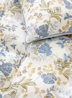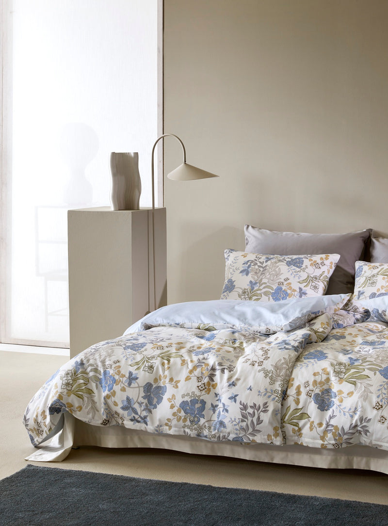 Raikas kukkakuosi luo rauhoittavan tunnelman – sinisävyinen klassinen kukkakuosi tuo luonnonläheistä harmoniaa makuuhuoneeseen. Reunat on viimeistelty tereellä, toisella puolella yksivärinen vaaleansininen kangas.