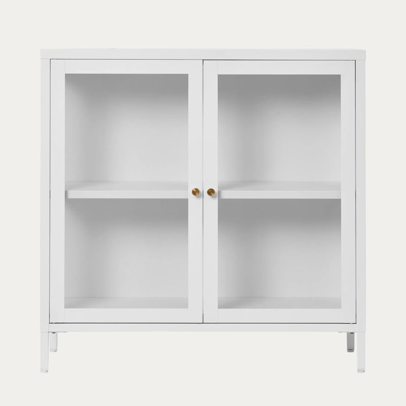 Tämä valkoinen vitriinikaappi on hillityn tyylikäs ja toimii hyvin erilaisten sisustusten kanssa. Sen lasiovet avaavat näkymän hyllytilaan, mikä tekee kaapista sekä käytännöllisen että siistin.