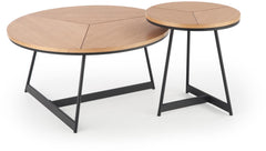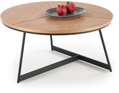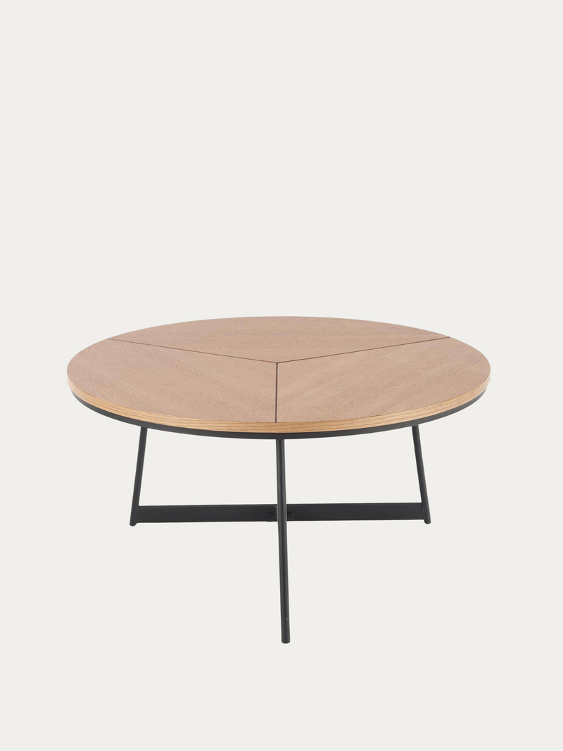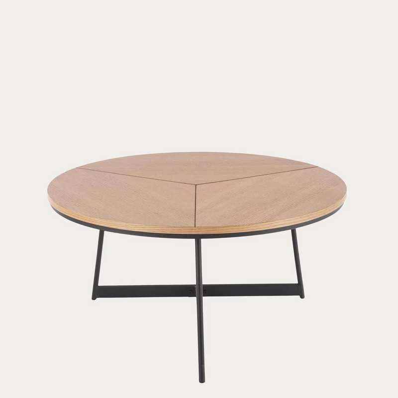 Karida-sohvapöytä on pyöreän muotoinen ja sen kansi on tammensävyinen. Mustat metalliset jalat antavat sille ajattoman ja tasapainoisen ilmeen.