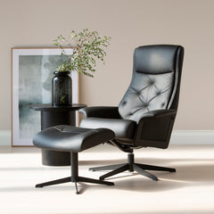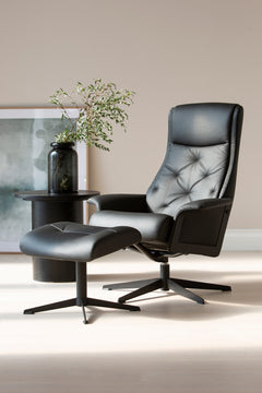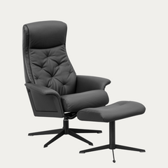 King tv-tuoli ja rahi mustana yhdistää käytännöllisyyden ja mukavuuden. Tuolin ja rahin pehmeä istuin kutsuu lepäämään ja katsomaan televisiota rauhassa.