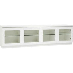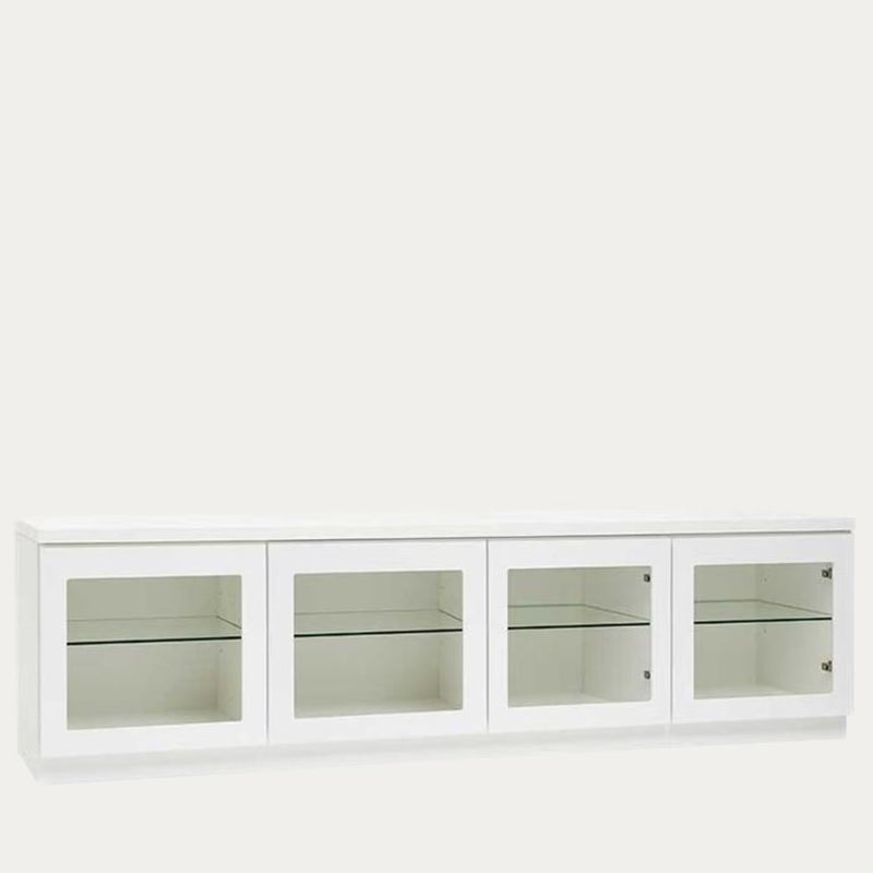 Tuo modernia eleganssia olohuoneeseesi tällä upealla tv-tasolla! Valkoinen runko ja lasihyllyt luovat raikkaan ja ilmavan ilmeen, joka sopii täydellisesti skandinaaviseen sisustukseen. Tv-tasossa on neljä tilavaa kaappia, joissa on läpinäkyvät lasiovet ja säädettävät lasihyllyt – ihanteellinen ratkaisu elektroniikalle, koriste-esineille tai kirjoille.