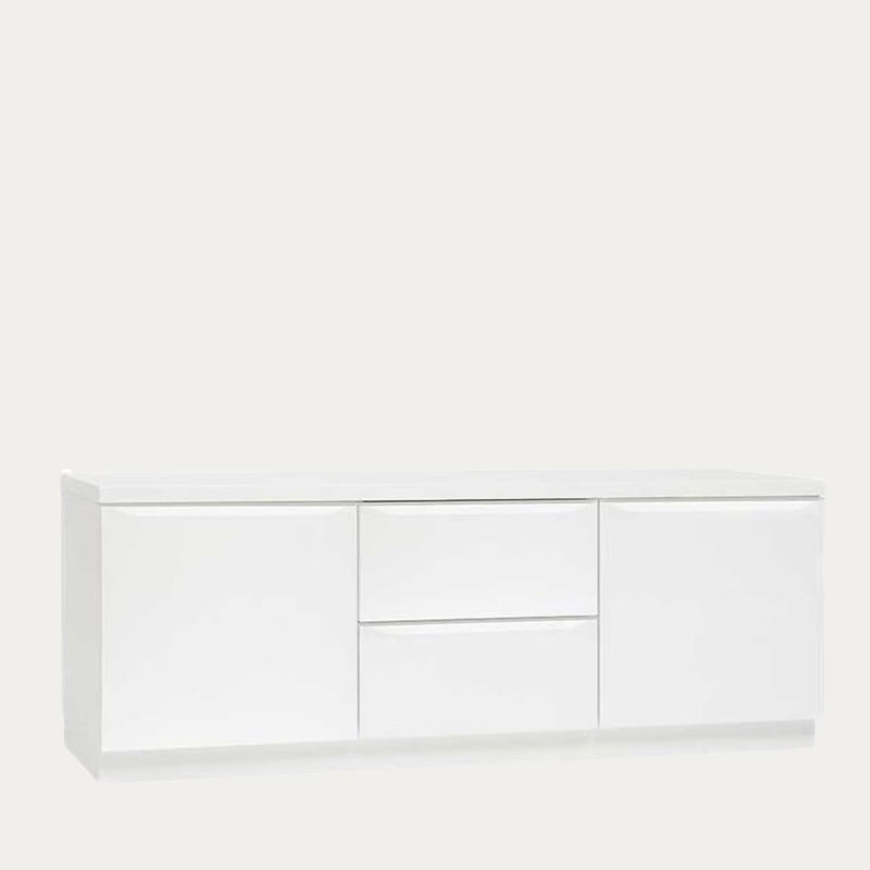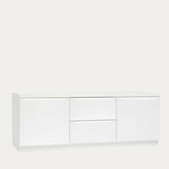 Tämä selkeälinjainen tv-taso yhdistää käytännöllisyyden ja modernin muotoilun tyylikkäästi. Kaksi tilavaa kaappia ja keskellä sijaitsevat vetimettömät laatikot tarjoavat runsaasti säilytystilaa niin medialaitteille, johdoille kuin muille kodin tarvikkeille.