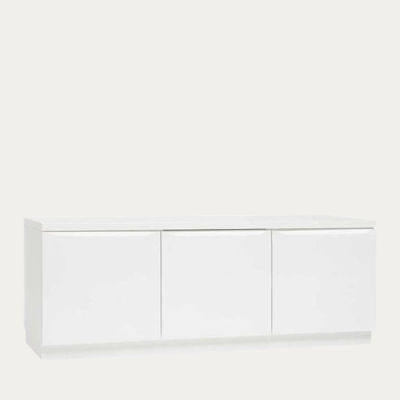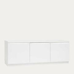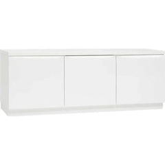 Tämä tyylikäs kolmiovinen tv-taso tarjoaa käytännöllistä säilytystilaa ja minimalistista muotoilua samassa paketissa. Vetimettömät, sileät ovet viimeistelevät rauhallisen ilmeen, joka sopii täydellisesti moderniin sisustukseen.
