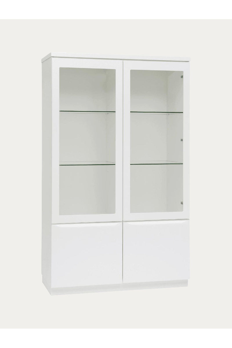 Tässä kauniissa vitriinissä yhdistyvät käytännöllisyys ja moderni muotoilu. Yläosan lasiovien taakse saat esille rakkaimmat koriste-esineet, astiastot tai kirjat, ja alaosan umpinaiset ovet kätkevät kaiken, mitä et halua näkyville. Lasihyllyt korostavat vitriinin keveyttä ja tyylikkyyttä.
