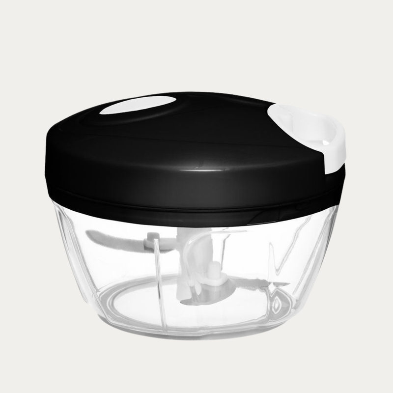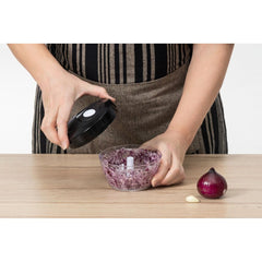 Silppua valkosipulit, yrtit ja muut pienet ainekset helposti ja nopeasti. Kolme ruostumattomasta teräksestä valmistettua terää nopeaan pilkkomiseen. Narun vetojen määrä määrittää pilkkomistason. Ei enää kyyneleitä sipuleita pilkkoessa. Käsinpesu.
