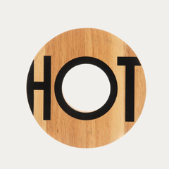 Kumipuusta valmistettu pannunalunen Hot-tekstillä. Koko 20 x 1,2 cm. Käsinpesu.