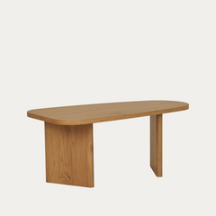 Melo-sohvapöytä on tammen sävyinen ja leveän soikea. Siinä on tyylikkään yksinkertainen muotoilu, joka sopii moneen sisustukseen.