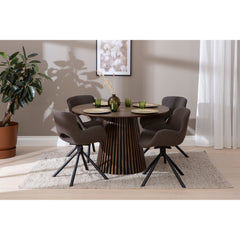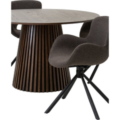 Tämä upea pyöreä ruokapöytä on suunniteltu huolella, ja sen vaikuttava, uurrettu jalka muistuttaa taidokkaasti sormipaneelia. Pöydän jykevä rakenne ja kauniit yksityiskohdat tekevät siitä ihanteellisen keskipisteen niin arkeen kuin juhlaan.