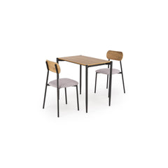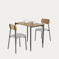 Tyylikäs ja tilaa säästävä ruokaryhmä kahdelle – täydellinen valinta pieniin keittiöihin, ruokailutiloihin tai opiskelijakämppiin. Minimalistinen muotoilu yhdistää lämpimän puunsävyn ja mustan metallin, tuoden sisustukseen ripauksen teollista ilmettä ja modernia selkeyttä.