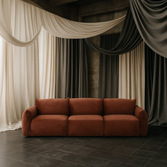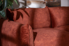 Sohvan lämmin kuparin sävy tuo kodikkuutta ja lämpöä sisustukseen. Se sopii hyvin monenlaisiin tiloihin ja väriyhdistelmiin.