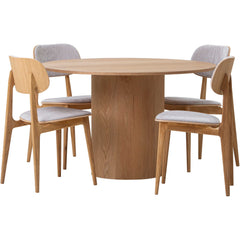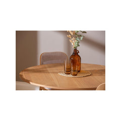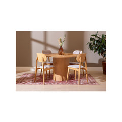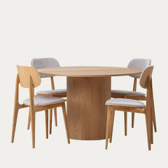 ROTONDO & STARBURST -ruokailuryhmä yhdistää pehmeät muodot, luonnolliset materiaalit ja skandinaavisen muotoilun sulavaksi kokonaisuudeksi. Pyöreä ROTONDO-ruokapöytä on valmistettu luonnollisen sävyisestä saarniviilusta, joka tuo tilaan lämpöä ja rauhallista eleganssia. Sen tukeva sylinterimäinen jalusta tekee pöydästä ryhmän näyttävän keskipisteen.