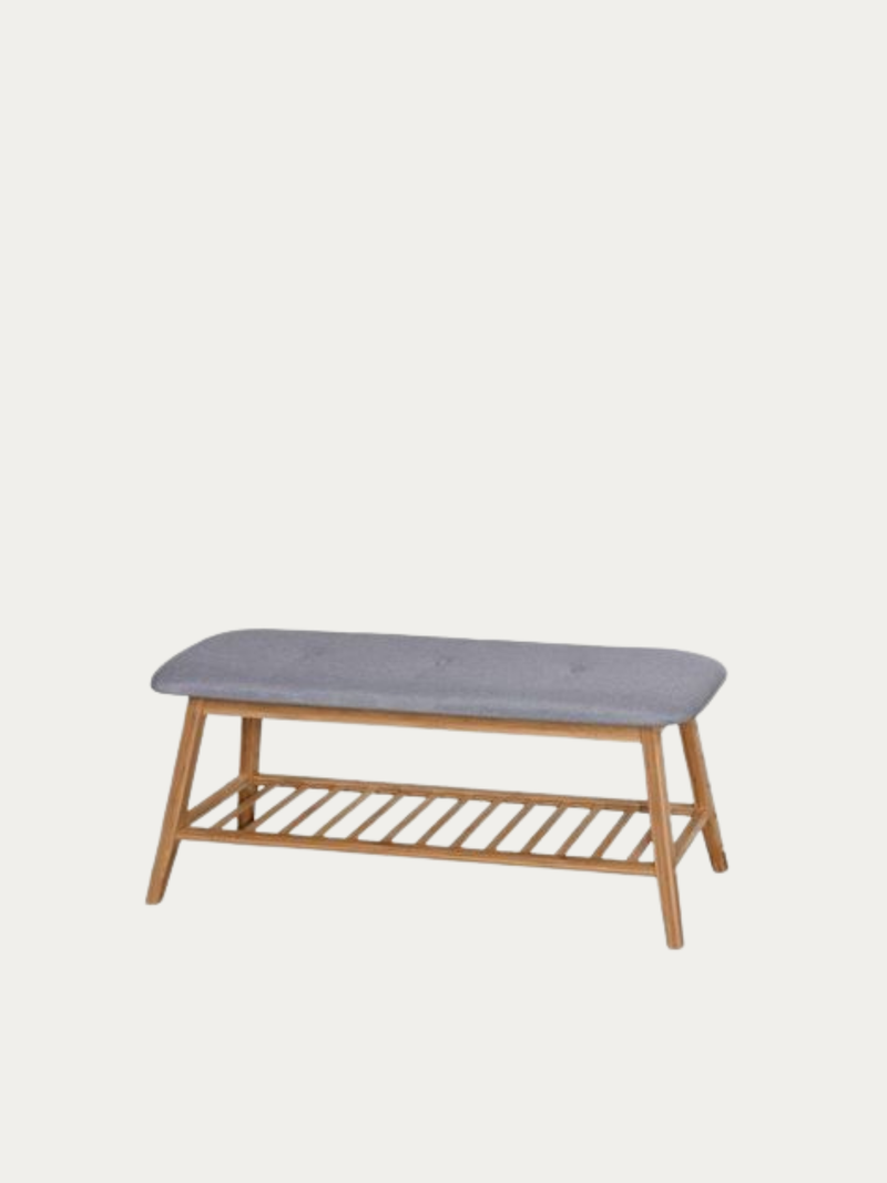 Shone-eteispenkki yhdistää istuinmukavuuden ja käytännöllisen säilytystilan tyylikkäästi. Luonnonvärinen puurunko tuo sisustukseen lämpöä, ja harmaa pehmustettu istuinosa tarjoaa mukavan paikan istua kengännauhoja sitoessa tai saapuessa kotiin. Penkin alla sijaitseva säleikköhylly sopii täydellisesti kenkien, laukkujen tai muiden tarvikkeiden säilyttämiseen, pitäen eteisen siistinä ja järjestyksessä.