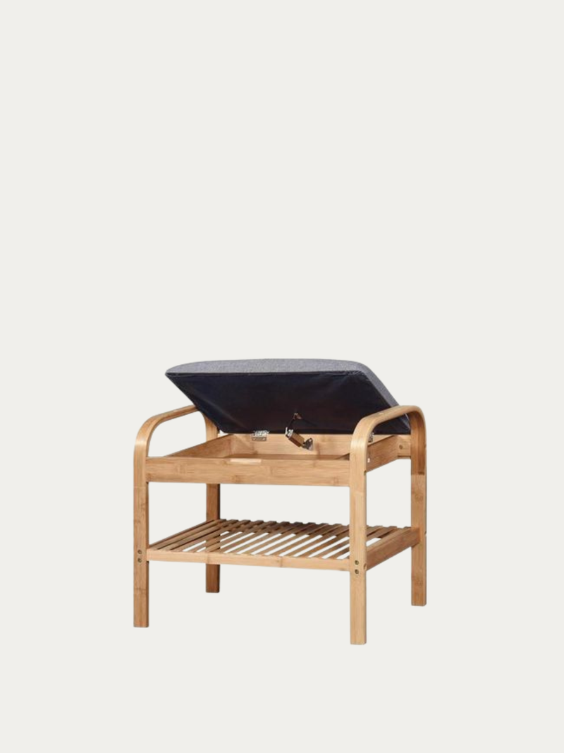 Sia-eteispenkki on tyylikäs ja käytännöllinen ratkaisu kodin sisääntuloon. Penkissä yhdistyvät kauniisti luonnonvärinen puurunko ja vaaleanharmaa, pehmustettu istuinosa, joka kätkee sisäänsä kätevän säilytystilan. Istuimen alta avautuva laatikko sopii täydellisesti esimerkiksi hansikkaiden, avainten tai muiden pienten tarvikkeiden säilyttämiseen. Alaosassa oleva säleikköhylly tarjoaa tilaa kengille, pitäen eteisen siistinä ja järjestyksessä.
