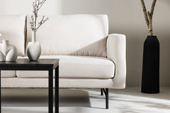 Kolmen istuttava Sky-sohva beigellä verhoilulla ja mustilla metallijaloilla sopii hyvin moderniin ja viihtyisään olohuoneeseen.
