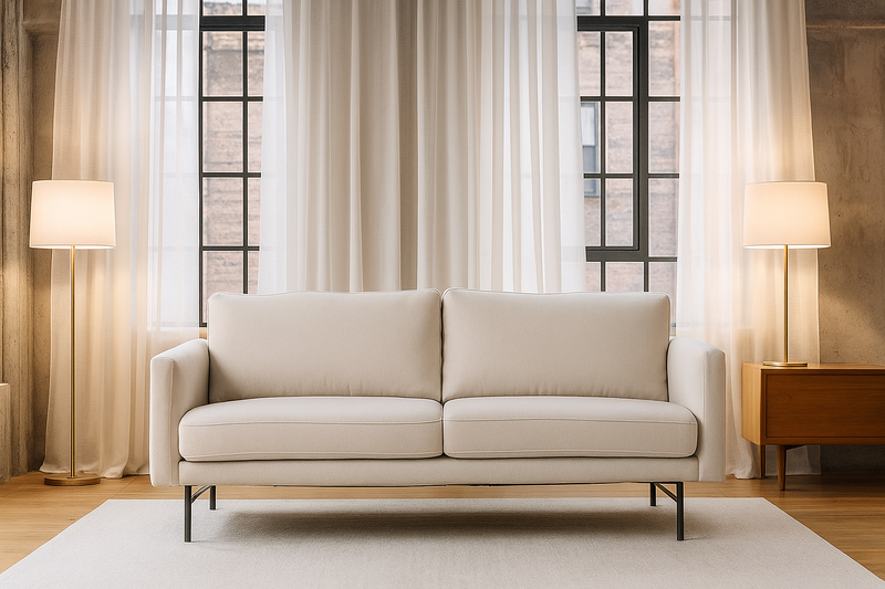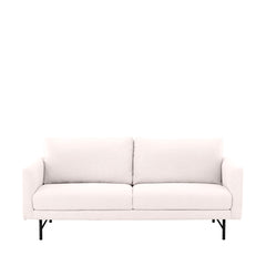 Sohvan jalat ovat mustaa metallia, mikä luo modernin kontrastin vaaleaan kankaaseen ja takaa tukevan rakenteen.