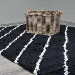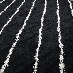 Musta Solina-matto jossa valkoiset viirut. Pehmeä ja kutsuva matto sopii eri kokoisina tilaan kuin tilaan, tuoden mustavalkoisen ilmeen.