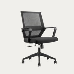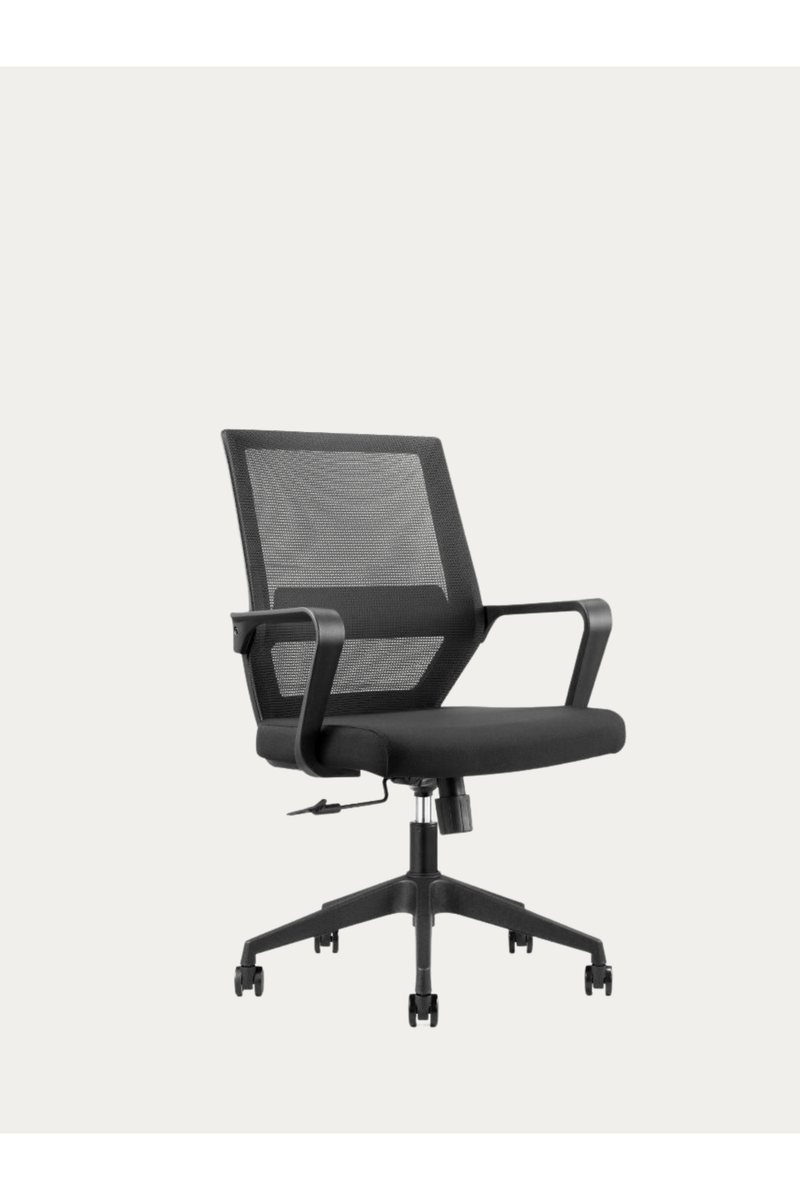 Matalaselkäisessä työtuolissa on ergonomisesti muotoiltu selkänoja, käsinojat ja mukavasti pehmustettu istuin. Selkänoja on hengittävää polyesteri-verkkokangasta.