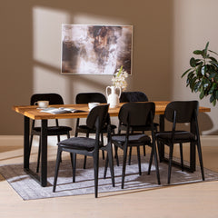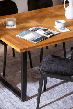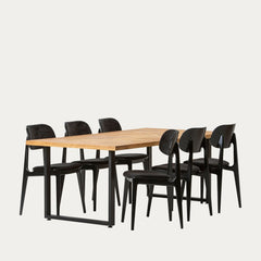 Tee vaikutus ruokailutilassasi tällä näyttävällä ja modernilla ruokaryhmällä, joka yhdistää luonnonmateriaalin lämpöä ja teollista tyyliä. Settiin sisältyy jykevä tammiviilupintainen pöytä mustilla metallijaloilla sekä kuusi kauniisti muotoiltua tuolia, jotka tarjoavat erinomaisen istuinmukavuuden.