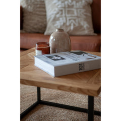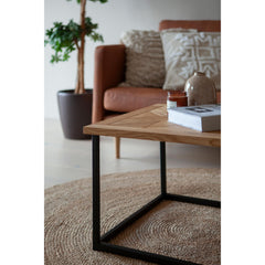 Tyylikäs sohvapöytä, jossa moderni muotoilu kohtaa luonnonläheiset materiaalit. Metalliset jalat tuovat pöytään ryhdikkyyttä ja kestävyyttä, kun taas kaunis tamminen kansi luo lämpimän ja kutsuvan ilmeen. Pöydän huolella viimeistelty pinta kuvioineen tekee siitä todellisen katseenvangitsijan missä tahansa tilassa. Tämä sohvapöytä sopii täydellisesti kodin pienempiinkin tiloihin.