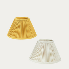 Kaunis luonnonvalkoinen lampunvarjostin rypytettyä, silkkiä muistuttavaa kangasta. Varjostin on vuorattu samanvärisellä puuvillakankaalla, ja siinä on E27-rengaskiinnitys.