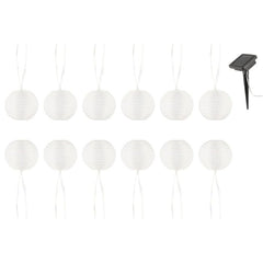 Luo lumoava iltavalaistus terassille tai puutarhaan helposti asennettavalla aurinkokennosta virtansa saavalla valoketjulla. Kauniita riisikennovalaisimia muistuttavat kuvut tuovat lämmintä tunnelmaa. Valoketjussa on 12 kpl LED-valonlähdettä. Tekniset tiedot: Aurinkopaneeli: 2V 80mA monikiteinen pii. Akku: 1.2V 300mAh AA NI-MH. Ladattava. 12 x LED, F5. Kytkintoiminto: On/Off/vilkkuva.