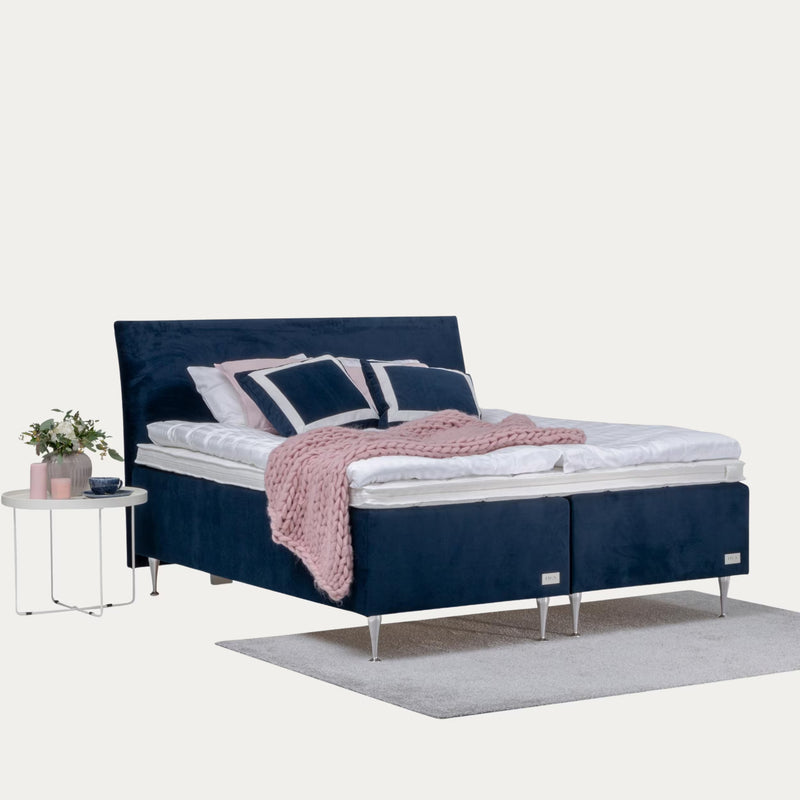 Tempolux 160 cm leveä pussijousitettu runkosänky tummansinisenä, valittavissa eri kovuuksia ja petauspatjavaihtoehtoja, saatavilla myös päädyllä tai ilman.