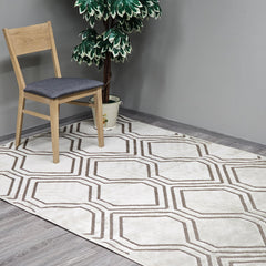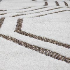 Tonava-matto on pehmeän valkoinen matto, jossa on hillityn ruskeita kuvioita. Kuviointi luo näyttävän kontrastin ja tuo mattoon ryhtiä ilman liiallista koristeellisuutta.