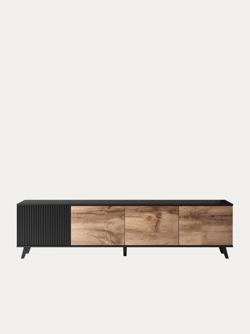 Tässä TV-tasossa neljä ovea avautuvat kätevästi "Push to open" -järjestelmällä, ja jokaisen oven takana on avoin osa, joka tarjoaa paikan järjestää laitteet siististi. Rakenne on vankkaa ja kestävää laminoitua lastulevyä, joka takaa pitkän käyttöiän. Viistot jalat lisäävät tyylikkyyttä kokonaisuuteen.